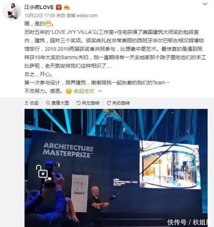 2019年,她再度掀起轩然大波——通过社交媒体高调宣布自己荣获一项国际建筑大奖,并附上设计图纸与领奖照片,试图展现多才多艺的一面。